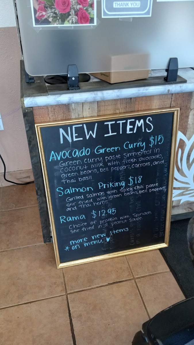 Panang curry paste simmered in coconut milk with carrots, bell peppers, basil, with steamed salmon. Served with steamed white rice.